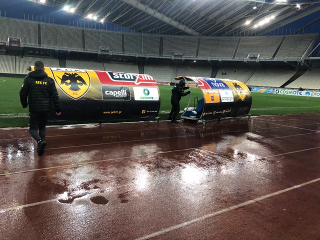 Οι άνεμοι που πνέουν, κάνουν δύσκολη την κατάσταση και μάλιστα οι υπεύθυνοι του γηπέδου μάζεψαν τις πλάγιες πινακίδες, ενώ… κυνηγούσαν και τους πάγκους.