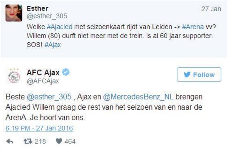 Συγκεκριμένα, ηλικιωμένος οπαδός του «Αίαντα», που μένει σε πόλη 40 χιλιόμετρα μακριά από το Άμστερνταμ, έψαχνε μέσω ανάρτησης της εγγονής του στο Twitter κάποιον να τον πηγαινοφέρνει στο γήπεδο της αγαπημένης του ομάδας. Yποστήριζε ότι λόγω ηλικίας ήταν αδύνατον να παίρνει το τρένο και αναζητούσε φίλο ίδιων οπαδικών φρονημάτων να του προσφέρει αυτή τη χαρά. Και από κει που ουδείς προσφερόταν, «έσκασε» η προσφορά του ίδιου του Άγιαξ.