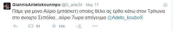Ο Γιάννης Αντετοκούνμπο μέσα από τον προσωπικό του λογαριασμό στο Twitter κάλεσε όλους του τους «φίλους» από τα Σεπόλια να παίξουν μπάσκετ στο γήπεδο της γειτονιάς.