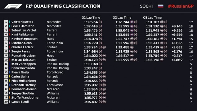 Σε μία από τις αγαπημένες του πίστες σ’ ολόκληρο το καλεντάρι, ο Βάλτερι Μπότας «έγραψε» τον ταχύτερο χρόνο και πήρε την pole position στο Grand Prix της Ρωσίας. Δεύτερος ο Λιούις Χάμιλτον που συμπλήρωσε το 1-2 της Μερσέντες, τρίτος ο Σεμπάστιαν Φέτελ.