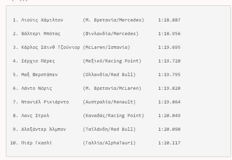 Ξανά ο Λιούις Χάμιλτον, θα εκκινήσει από την pole position ενός γκραν πρι! Στην προκειμένη περίπτωση, ο Βρετανός οδηγός της Mercedes θα είναι μπροστά από τους υπόλοιπους αντιπάλους του στον αυριανό αγώνα της Ιταλίας στο γκραν πρι της Μόντσα, καθώς έκανε τον ταχύτερο χρόνο στις σημερινές κατατακτήριες δοκιμές. Ο Χάμιλτον έκανε και τον ταχύτερο γύρο στην ιστορία της F1 (1:18.887, ρεκόρ πίστας) μετά από «μάχη» με τον «ομόσταυλό» του Βάλτερι Μπότας (1:18.956). Ο Φινλανδός θα ξεκινήσει από τη 2η θέση, ενώ στην τρίτη θα είναι ο Ισπανός πιλότος της MacLaren, Κάρλος Σάινθ. Η σημερινή pole position επέκτεινε το ρεκόρ του Χάμιλτον σε 94 στην καριέρα του, ενώ ήταν η 6η pole position του Βρετανού σε 8 αγώνες της τρέχουσας περιόδου.