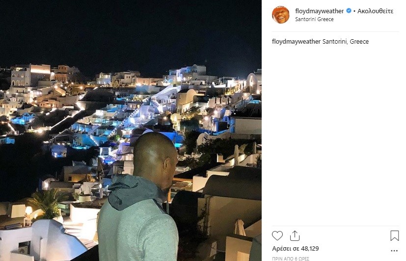 Ο Floyd Mayweather ταξίδεψε στην Ελλάδα και επισκέπτεται την Σαντορίνη, όπου απολαμβάνει τις φυσικές ομορφιές αλλά και την ηρεμία. Ανάρτησε μάλιστα, και σχετικές φωτογραφίες στο λογαριασμό του στο Instagram, όπου έχει 21.500.000 ακόλουθους. Οι φωτογραφίες από την Ελλάδα έχουν συγκεντρώσει συνολικά περισσότερα από 300.000 likes.