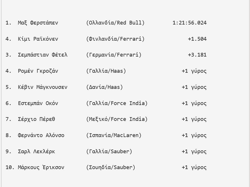 Να σημειωθεί πως η σημερινή ήταν «μαύρη» για την Mercedes, καθώς στη διάρκεια της κούρσας εγκατέλειψαν και οι δύο οδηγοί της, ο παγκόσμιος πρωταθλητής, Λιούις Χάμιλτον, και ο Βαλτέρι Μπότας, λόγω μηχανικών προβλημάτων, όπως και ο Ντάνιελ Ρικιάρντο της Red Bull. Η ατυχία της Mercedes ωφέλησε τη Ferrari, καθώς ο Φέτελ προσπέρασε τον Χάμιλτον στην κορυφή της βαθμολογίας των οδηγών, μόλις μ’ έναν βαθμό διαφορά.