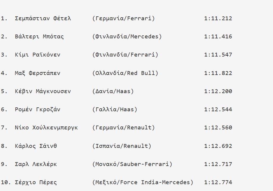 Ο Σεμπάστιαν Φέτελ θα εκκινήσει από την πρώτη θέση στο αυριανό γκραν πρι της Γερμανίας, που θα διεξαχθεί στην πίστα του Χοκενχάιμ και αποτελεί τον 11ο «σταθμό» στο φετινό πρωτάθλημα της Φόρμουλα Ενα. Ο Γερμανός πιλότος της Φεράρι, που προηγείται στη βαθμολογία των οδηγών, πέτυχε τον ταχύτερο χρόνο στα σημερινά επίσημα δοκιμαστικά και θα βρεθεί στην pole position, έχοντας δίπλα του τον Φινλανδό Βάλτερι Μπότας με Mercedes. Στην τρίτη θέση των δοκιμαστικών βρέθηκε η δεύτερη Φεράρι, με τον Φινλανδό Κίμι Ραϊκόνεν, ενώ ο παγκόσμιος πρωταθλητής, Λιούις Χάμιλτον, υποχρεώθηκε να σταματήσει μετά το πρώτο σκέλος των επίσημων δοκιμαστικών, εξαιτίας προβλήματος στο μονοθέσιό του (σ.σ. στα υδραυλικά), και θα ξεκινήσει από τις πίσω σειρές του αγώνα. Υπενθυμίζεται ότι ο Βρετανός βρίσκεται οκτώ βαθμούς πίσω από τον Φέτελ στη βαθμολογία, αλλά πλέον ο Γερμανός έχει αύριο «χρυσή» ευκαιρία να αυξήσει τη μεταξύ τους διαφορά.