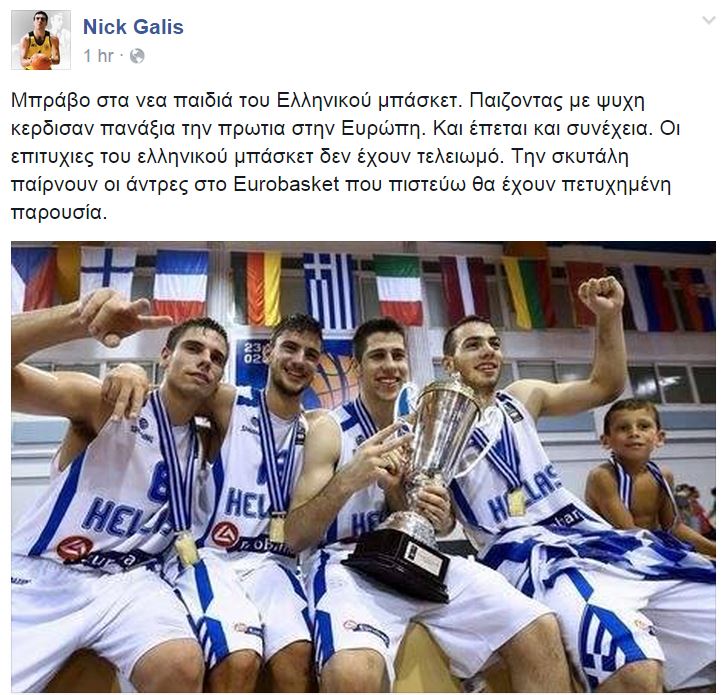 Μέσα από τη σελίδα του στο facebook, o Νίκος Γκάλης συνεχάρη την Εθνική Εφήβων για το χρυσό μετάλλιο κι ευχήθηκε ανάλογη συνέχεια στην Εθνική Ανδρών.