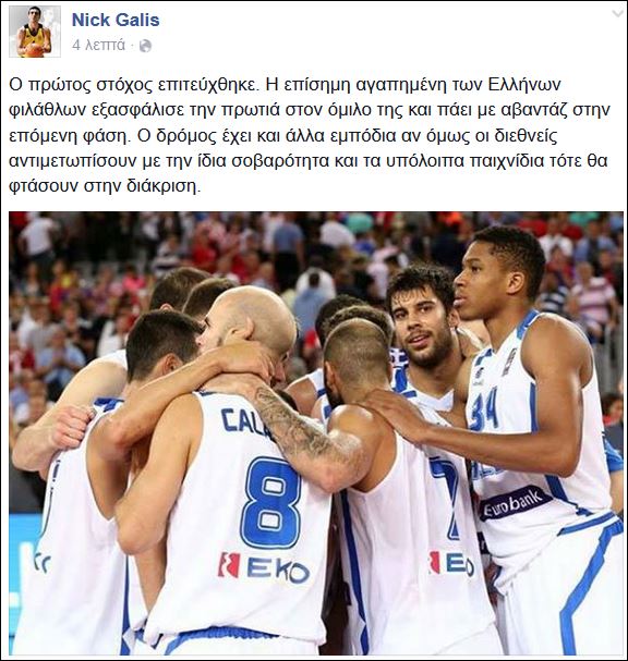 «Ο πρώτος στόχος επιτεύχθηκε. Η επίσημη αγαπημένη των Ελλήνων φιλάθλων εξασφάλισε την πρωτιά στον όμιλο της και πάει με αβαντάζ στην επόμενη φάση. Ο δρόμος έχει και άλλα εμπόδια αν όμως οι διεθνείς αντιμετωπίσουν με την ίδια σοβαρότητα και τα υπόλοιπα παιχνίδια τότε θα φτάσουν στην διάκριση», έγραψε στη σελίδα του στο Facebook ο Θρύλος του ελληνικού μπάσκετ.