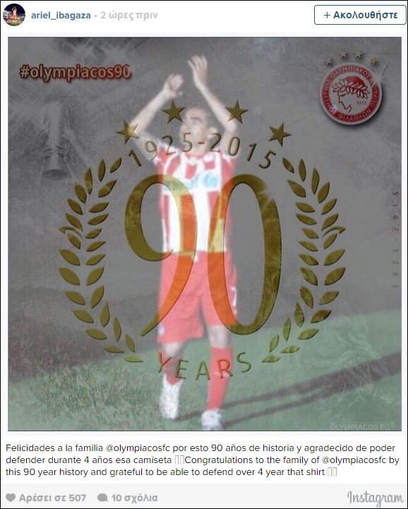 «Συγχαρητήρια στην οικογένεια του Ολυμπιακού για τα 90 χρόνια ιστορίας. Είμαι ευγνώμων που μπόρεσα να φορώ για πάνω από τέσσερα χρόνια αυτή τη φανέλα», έγραψε ο Αργεντινός στο Instagram.
