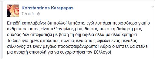 Ο διευθυντής επικοινωνίας της ΠΑΕ Ολυμπιακός Κώστας Καραπαπάς σχολίασε μέσω Facebook την απομάκρυνση του Μίτσελ από την τεχνική ηγεσία της ομάδας.