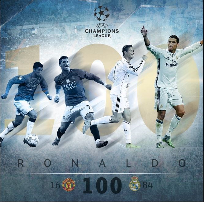 Ο Ρονάλντο μετράει πλέον 97 στο Champions League, 2 στο UEFA Super Cup και 1 στα προκριματικά του Champions League. Από αυτά τα 100, τα 84 έχει πετύχει με τη Ρεάλ και 16 με τη Μαν. Γιουνάιτεντ.