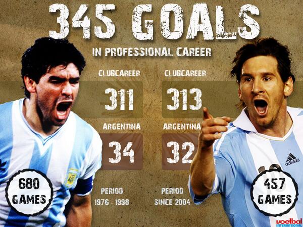 Συγκεκριμένα ο «Λιο» έχει σημειώσει 313 γκολ με τη φανέλα των μπλαουγκράνα και 32 με τη φανέλα της Αργεντινής, ενώ ο Μαραντόνα είχε πετύχει 34 γκολ με την Αργεντινή και 311 με τους συλλόγους στους οποίους αγωνίστηκε.