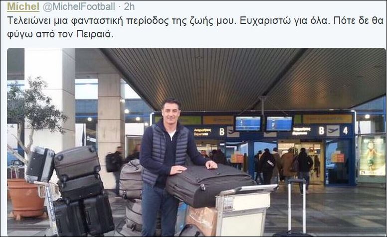 Την αγάπη του για τον Ολυμπιακό και τον Πειραιά εξέφρασε για άλλη μια φορά ο Μίτσελ. Ο Ισπανός τεχνικός ανέβασε στο λογαριασμό του στο Twitter φωτογραφία από το αεροδρόμιο «Ελευθέριος Βενιζέλος» πριν την αναχώρηση του για τη Μαδρίτη, με το ακόλουθο σχόλιο: