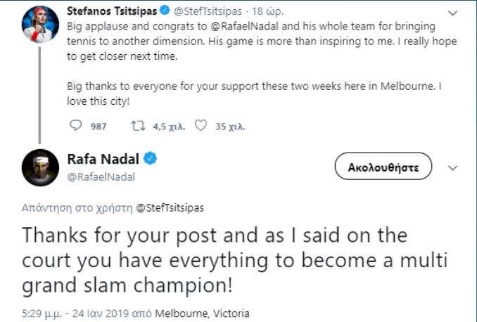Μετά την αναμέτρησή τους στα ημιτελικά του Αυστραλιανού Όπεν, ο Στέφανος Τσιτσιπάς συνεχάρη στα social media τον Ράφα Ναδάλ, αναφέροντας ότι πάει το τένις σε άλλη διάσταση και πως το παιχνίδι του αποτελεί έμπνευση για εκείνον.Ο Ισπανός, γνωστός για τον ταπεινό χαρακτήρα του, σχολίασε το ποστ του Στέφανου και τα λόγια του πρέπει να κάνουν τον 20χρονο Έλληνα τενίστα υπερήφανο: «Σε ευχαριστώ για το ποστ σου και όπως είπα και on court, έχεις τα πάντα για να γίνεις νικητής πολλών Grand Slam».