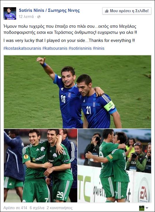 Το εγκώμιο του Κώστα Κατσουράνη έπλεξε με ανάρτησή του στο Facebook ο Σωτήρης Νίνης. Ο άσος του Παναθηναϊκού ευχαρίστησε τον πρώην συμπαίκτη του, ο οποίος ανακοίνωσε σήμερα την αποχώρησή του από την ενεργό δράση