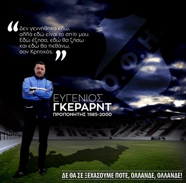 «Σήμερα ο ΟΦΗ αποχαιρετάει, ένα μεγάλο κομμάτι της ιστορίας του και της κληρονομιάς του. Θα είμαστε όλοι εκεί Μίστερ, για το τελευταίο αντίο. Εσύ μπορεί να έφυγες, αλλά θα μείνεις για πάντα στη μνήμη μας. Γιατί πολύ απλά ο ΟΦΗ είναι και ένα κομμάτι δικό σου. Ένα κομμάτι από σένα! Δεν θα σε ξεχάσουμε ποτέ, Ολλανδέ, Ολλανδέ!» αναφέρει η ανακοίνωση του ΟΦΗ.