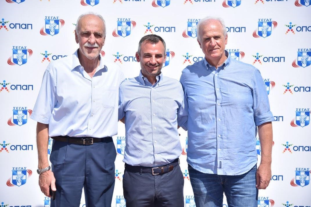 Βασίλης Σεβαστής (Γενικός Γραμματέας ΣΕΓΑΣ), Πάνος Γαβριήλ (Διευθυντής Εταιρικής Επικοινωνίας ΟΠΑΠ), Γιάννης Κουτσιώρας (Εθνικός Προπονητής ΣΕΓΑΣ)