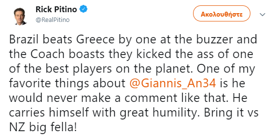 «Η Βραζιλία νίκησε την Ελλάδα με έναν πόντο στο φινάλε και ο προπονητής της είπε ότι τις… έβρεξαν σε έναν από τους καλύτερους παίκτες του πλανήτη. Ένα από τα αγαπημένα μου πράγματα στον Γιάννη Αντετοκούνμπο είναι ότι ποτέ δεν θα έκανε ένα τέτοιο σχόλιο. Είναι πολύ ταπεινός. Δείξε το παιχνίδι σου κόντρα στη Νέα Ζηλανδία μεγάλε!».