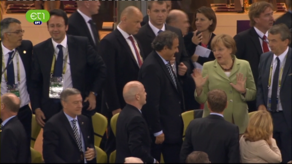 Ο Μισέλ Πλατινί δεν είχε ιδιαίτερη όρεξη για συζήτηση με την καγκελάριο που καθόταν δίπλα του. Αυτό τουλάχιστον κατέγραψε ο φακός στις “σπάνιες” βόλτες του στις κερκίδες του σταδίου.