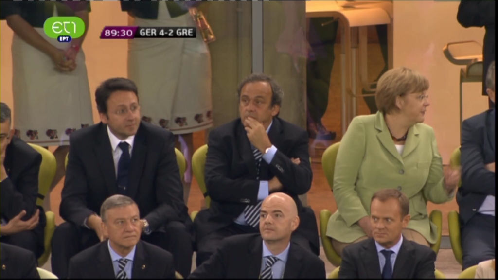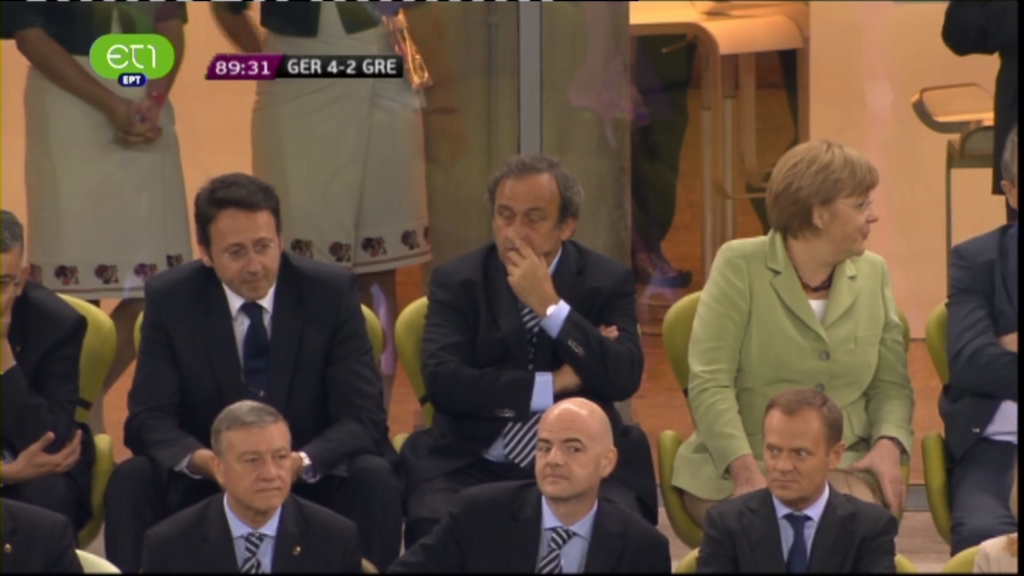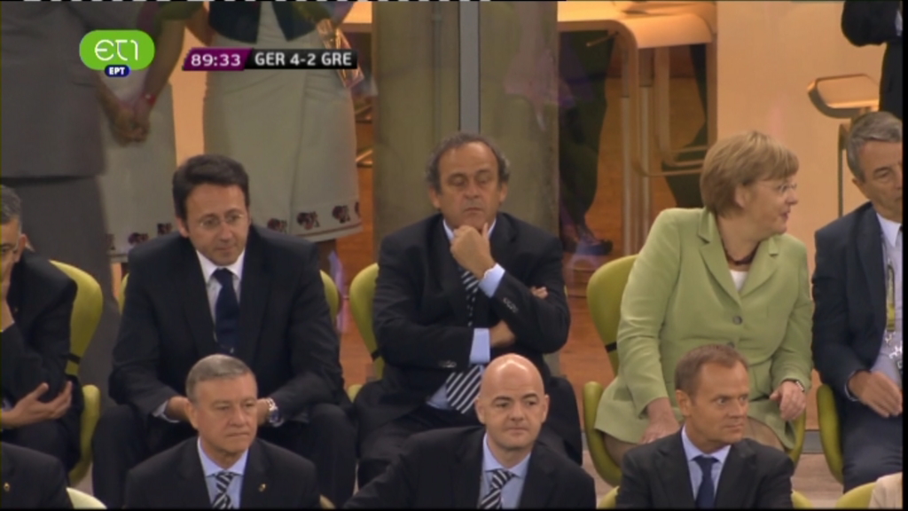 Ο Μισέλ Πλατινί δεν είχε ιδιαίτερη όρεξη για συζήτηση με την καγκελάριο που καθόταν δίπλα του. Αυτό τουλάχιστον κατέγραψε ο φακός στις “σπάνιες” βόλτες του στις κερκίδες του σταδίου.