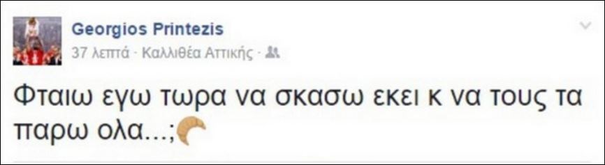 Την «αγανάκτησή» του εξέφρασε ο Γιώργος Πρίντεζης για το Survivor,με αφορμή τη χθεσινή δοκιμασία των δύο ομάδων του παιχνιδιού, σχολιάζοντας με χιουμοριστικό τρόπο τα όσα έγιναν.Το έπαθλο για την νικήτρια ομάδα ήταν από ένα κρουασάν. Ωστόσο, το τελικό στάδιο έμοιαζε με βολές στο μπάσκετ, με αρκετούς παίκτες να μην είναι ιδιαίτερα εύστοχοι. Αυτό είχε ως αποτέλεσμα, ο καλαθοσφαιριστής του Ολυμπιακού να «τρελαθεί» γράφοντας στον προσωπικό του λογαριασμό στο facebook: «Φταίω εγώ τώρα να σκάσω εκεί και να τους τα πάρω όλα;».