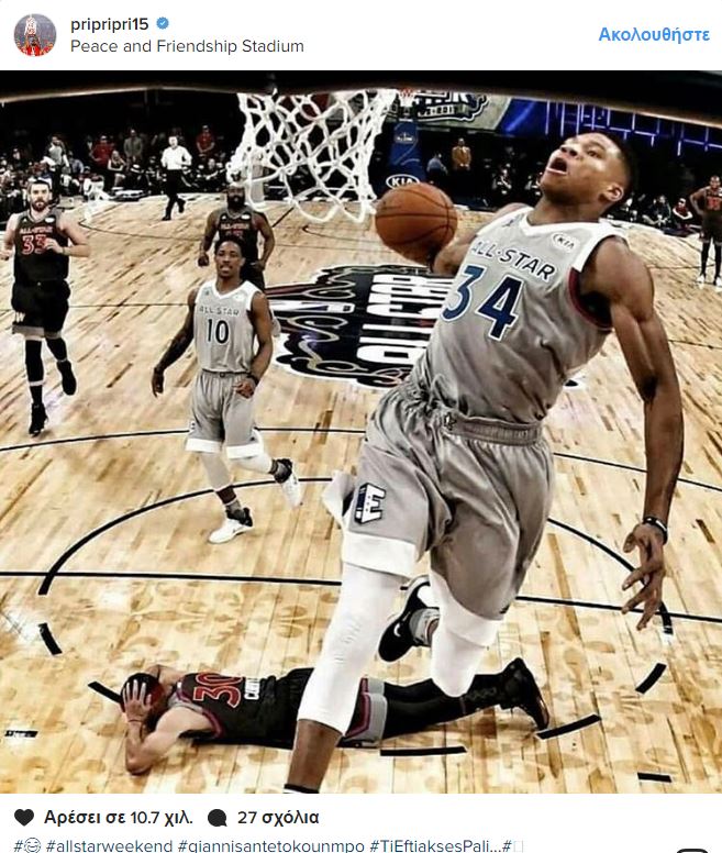 Στο ταλέντο του Γιάννη Αντετοκούνμπο, υποκλίθηκε ο Γιώργος Πρίντεζης με αφορμή την συμμετοχή του πρώτου στο All Star Game.Ο Έλληνας διεθνής παίκτης ανέβασε στο Instagram, μια φωτογραφία του άσου των Μπακς, που απεικονίζει ένα από τα εντυπωσιακά καρφώματα που επιχείρησε στην Νέα Ορλεάνη.Μάλιστα συνόδευσε την φωτογραφία γράφοντας: «Τι έφτιαξες πάλι..»