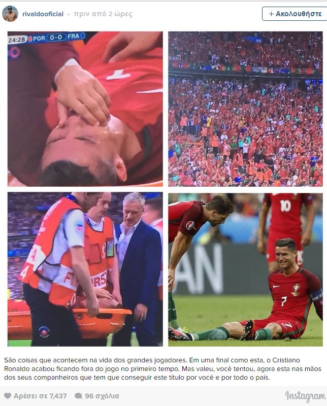 Μήνυμα στήριξης στον άτυχο της βραδιάς Κριστιάνο Ρονάλντο έστειλε ο σπουδαίος ποδοσφαιριστής Ριβάλντο, μετά τον τραυματισμό του πρώτου στον μεγάλο τελικό της Γαλλίας.