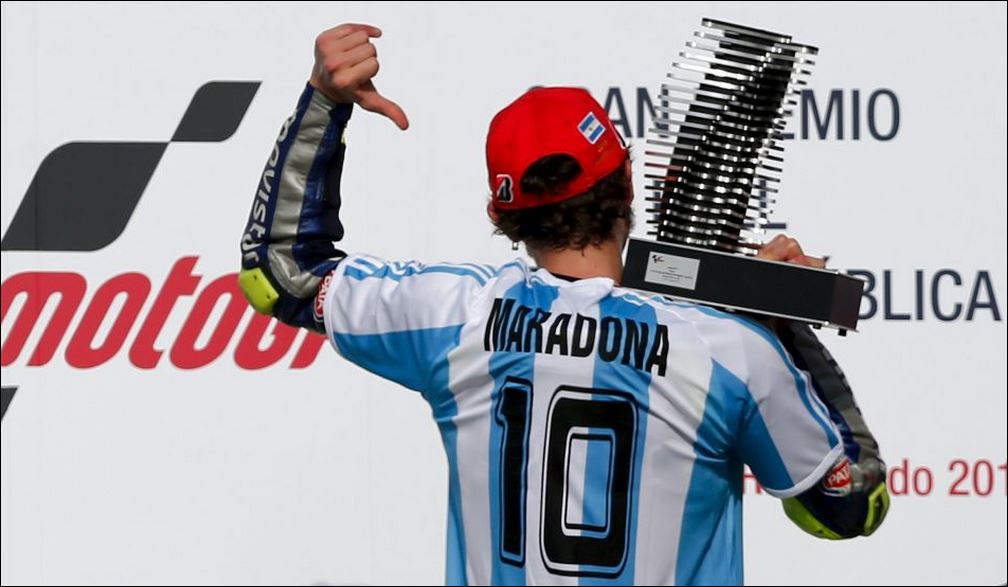 Φορώντας μια φανέλα του Ντιέγκο Μαραντόνα πανηγύρισε ο Βαλεντίνο Ρόσι τη δεύτερη επικράτησή του στο φετινό πρωτάθλημα MotoGP στην Αργεντινή προκειμένου να τιμήσει τη χώρα του θρύλου του παγκόσμιου ποδοσφαίρου.