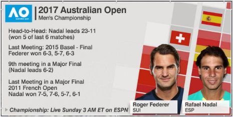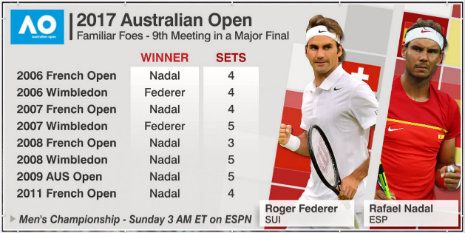 Πρόκειται για τον σημαντικότερο αγώνα του φετινού Australian Open και πιθανότατα τον σημαντικότερο και στη χρονιά, παρόλο που βρισκόμαστε ακόμα στην αρχή της. Ο Roger Federer θα συναντήσει τον Rafael Nadal για 35η φορά στην καριέρα του, στα πλαίσια του τελικού του Grand Slam της Μελβούρνης, από τον οποίο και θα προκύψουν ιστορικά γεγονότα, όποιος και αν είναι ο νικητής.