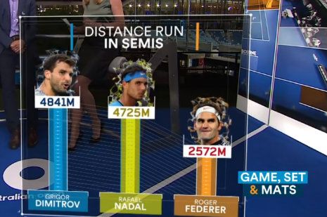 Αν και έχουν παίξει ακριβώς τον ίδιο αριθμό σετ (23), ο Nadal έχει μείνει πολύ περισσότερη ώρα στο court και έχει τρέξει πολύ περισσότερο από τον Ελβετό. Μόνο στα ημιτελικά, χρειάστηκε να διανύσει 4,7 χιλιόμετρα, σχεδόν τη διπλάσια απόσταση από τον Roger!
