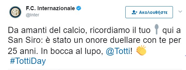 Η Ίντερ αποχαιρέτησε τον capitano της Ρόμα με ένα tweet: “Ήταν τιμή μας να μονομαχούμε μαζί σου επί 25 χρόνια εδώ στο Σαν Σίρο. Καλή τύχη Τόττι!”