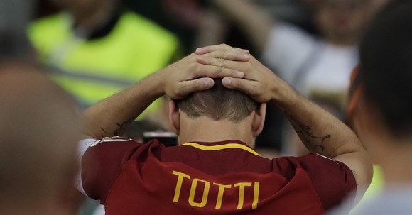 Με διστακτικό περπάτημα και βουρκωμένα μάτια, ο Τότι έκανε τα τελευταία βήματά του στον στίβο του Ολίμπικο ως ποδοσφαιριστής των “τζαλορόσι”.