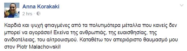 «Καρδιά και ψυχή φτιαγμένες από τα πολυτιμότερα μέταλλα που κανείς δεν μπορεί να αγοράσει! Εκείνα της ανθρωπιάς, της ευαισθησίας, της ανιδιοτέλειας, του αλτρουισμού. Καταθέτω τον απεριόριστο θαυμασμό μου στον Piotr Malachowski!»