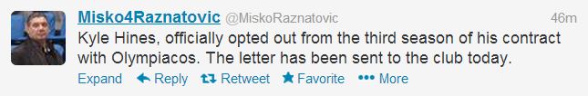 Ήταν αναμενόμενο, πλέον είναι και τυπικό… Ο Κάιλ Χάινς μετά ΚΑΙ τη φετινή εξαιρετική του σεζόν δεν θα έκανε χρήση του τρίτου χρόνου του συμβολαίου του με τον Ολυμπιακό αναζητώντας μία πολύ καλύτερη προσφορά από τις περίπου 400.000 δολάρια που προβλέπονταν στην αρχική συμφωνία του με την ομάδα.