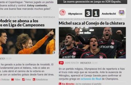 Gazzetta dello Sport: Μπενφίκα-Παρί 2-1. Ολυμπιακός-Ά��τερλεχτ 3-1. Οι Έλληνες στους “16”. Η ντοπιέτα (σ.σ. δύο γκολ) του Σαβιόλα στέλνει τον Ολυμπιακό στη δεύτερη φάση.
