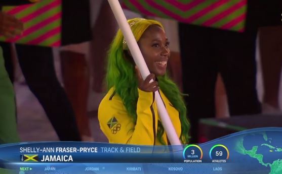 Εντυπωσιακή ήταν και αθλήτρια από την Τζαμάικα, Σέλι Αν Φρέιζερ Πράις, η οποία ήταν ντυμένη στα χρώματα της Τζαμάικα. Όπως φαίνεται και στις φωτογραφίες η σημαιοφόρος της Τζαμάικα, είχε βάψει μέχρι και τα μαλλιά της κίτρινα και πράσινα.