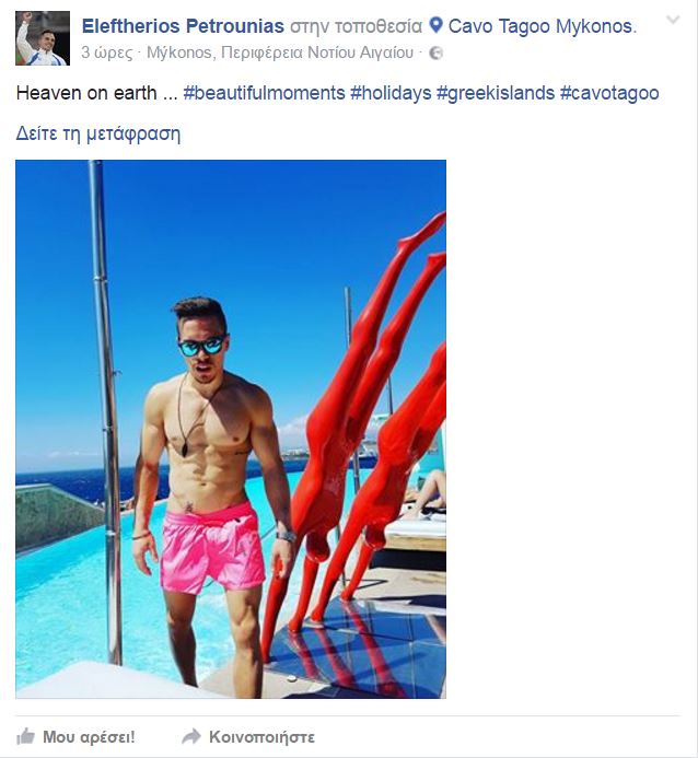 Όπως φαίνεται και στη φωτογραφία που ανέβασε στον προσωπικό του λογαριασμό στο Facebook, κάνει μπάνιο σε πισίνα στη Μύκονο και γράφει: «επίγειος παράδεισος… υπέροχες στιγμές στις καλοκαιρινές μου διακοπές στα ελληνικά νησιά».