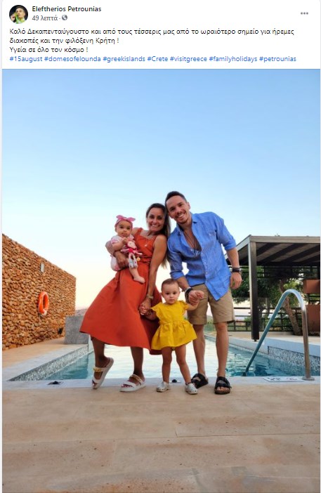 «Καλό Δεκαπενταύγουστο και από τους τέσσερις μας από το ωραιότερο σημείο για ήρεμες διακοπές και την φιλόξενη Κρήτη !Υγεία σε όλο τον κόσμο !», ανέφερε με το post του να συνοδεύεται από μία οικογενειακή φωτογραφία.