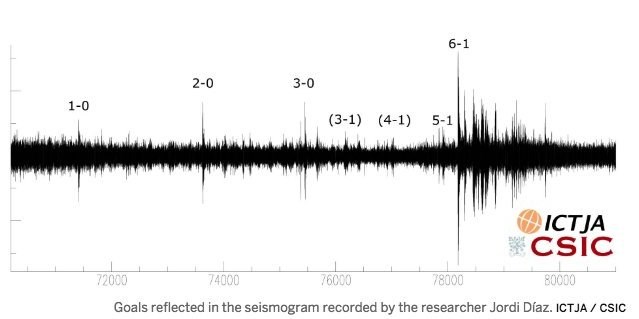 Οι ενθουσιώδεις πανηγυρισμοί του έκτου γκολ της Μπαρτσελόνα στο «Καμπ Νόου» έστειλε… σεισμικά κύματα τα οποία κατέγραψε και μελέτησε το Ινστιτούτο Γεωλογίας στη Βαρκελώνη.Ο σεισμολόγος, Ζόρντι Ντίας, αντίκρισε στον σεισμογράφο του Ινστιτούτου Jaume Almera, ο οποίος βρίσκεται σε απόσταση που δεν ξεπερνά το 1 χλμ. από το Καμπ Νόου, τα «σεισμικά» κύματα που μεταδόθηκαν από το γήπεδο της Μπαρτσελόνα κατά τη διάρκεια της μαγικής βραδιάς όπου γράφτηκε ιστορία στον επαναληπτικό της φάσης των «16» απέναντι στην Παρί Σεν Ζερμέν.«Είναι η μεγαλύτερη δόνηση που έχει καταγράψει η συγκεκριμένη συσκευή μελέτης από την ημέρα που την εγκαταστήσαμε, πριν από πέντε χρόνια» ανέφερε ο Ζόρντι Ντίας και παρουσίασε την παρακάτω φωτογραφία: