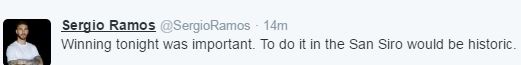 Μάλιστα ο αμυντικός ογκόλιθος της ομάδας, Σέρχιο Ράμος έγραψε στον προσωπικό του λογαριασμό στο Twitter: «Ήταν σημαντική η σημερινή νίκη. Εάν κάνουμε το ίδιο και στο Σαν Σίρο, θα είναι ιστορικό».