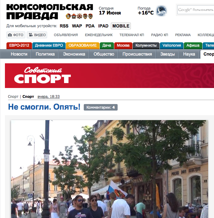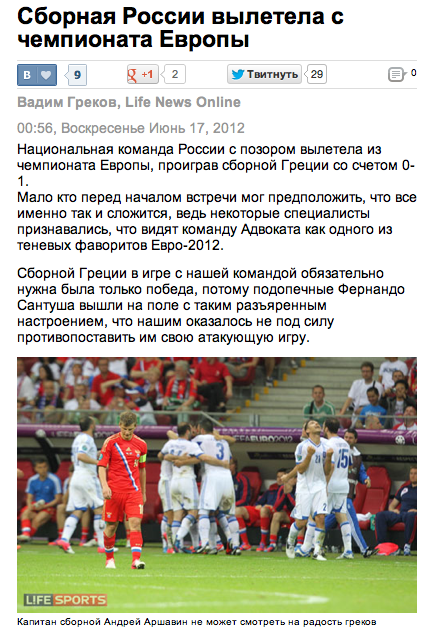 Ποια είναι η άποψη των μέσων μαζικής ενημέρωσης της Ρωσίας για την χθεσινή νίκη της Ελλάδας επί της… αρκούδας με 1-0.”Η Εθνική της Ρωσίας έξω από το Euro”, γράφει το lifenews.ru. “Η εθνική ομάδα της Ρωσίας αποχώρησε με ντροπή από το Euro, χάνοντας από την Εθνική της Ελλάδας με αποτέλεσμα 0-1″.”Λίγοι μπορούσαν να προβλέψουν πριν την αρχή του αγώνα, ότι όλα θα εξελιχθούν με αυτόν τον τρόπο, αφού οι ειδικοί είχαν αναφέρει πως η ομάδα του Advocaat ήταν ένα από τα φαβορί του Euro-2012. Η Εθνική της Ελλάδας χρειαζόταν να κερδίσει για να μπει στους 8 και για αυτό η ομάδα του Φερνάντο Σάντος μπήκε στο γήπεδο με πολύ οργή, την οποία δεν κατάφεραν να ξεπεράσουν οι δικοί μας και να επιβάλλουν το επιθετικό τους παιχνίδι”.