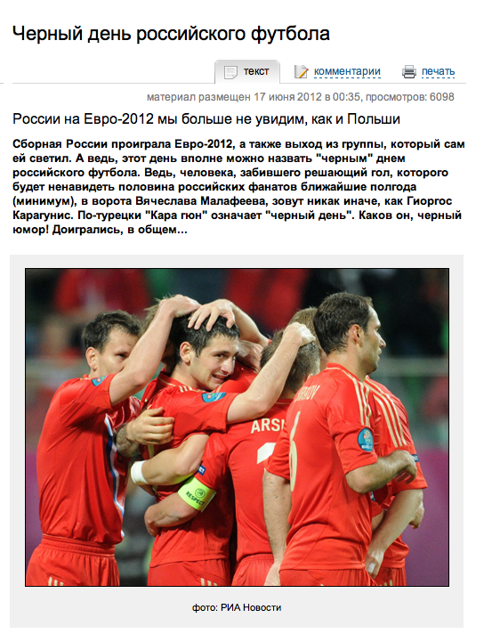 Ενώ το ria.ru γράφει πως “οι Ρώσοι παραχώρησαν τη θέση τους στους Έλληνες με σκορ 0:1” και ταυτόχρονα παρουσιάζει την άποψη του Γλουσάκοβ, ο οποίος δήλωσε πως “η αποχώρηση της Ρωσίας από το Euro είναι ντροπή”.