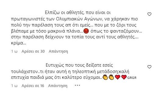 Επιπλέον, προκλήθηκε δυσαρέσκεια από το γεγονός ότι κατά την τηλεοπτική μετάδοση, οι διοργανωτές δεν κατάφεραν να προβάλλουν τον Γιάννη Αντετοκούνμπο, ο οποίος συμμετείχε ως σημαιοφόρος μαζί με την Αντιγόνη Ντρισμπιώτη ακόμα και κάτω από την ανάρτηση της Ελληνικής Ολυμπιακής Επιτροπής.
