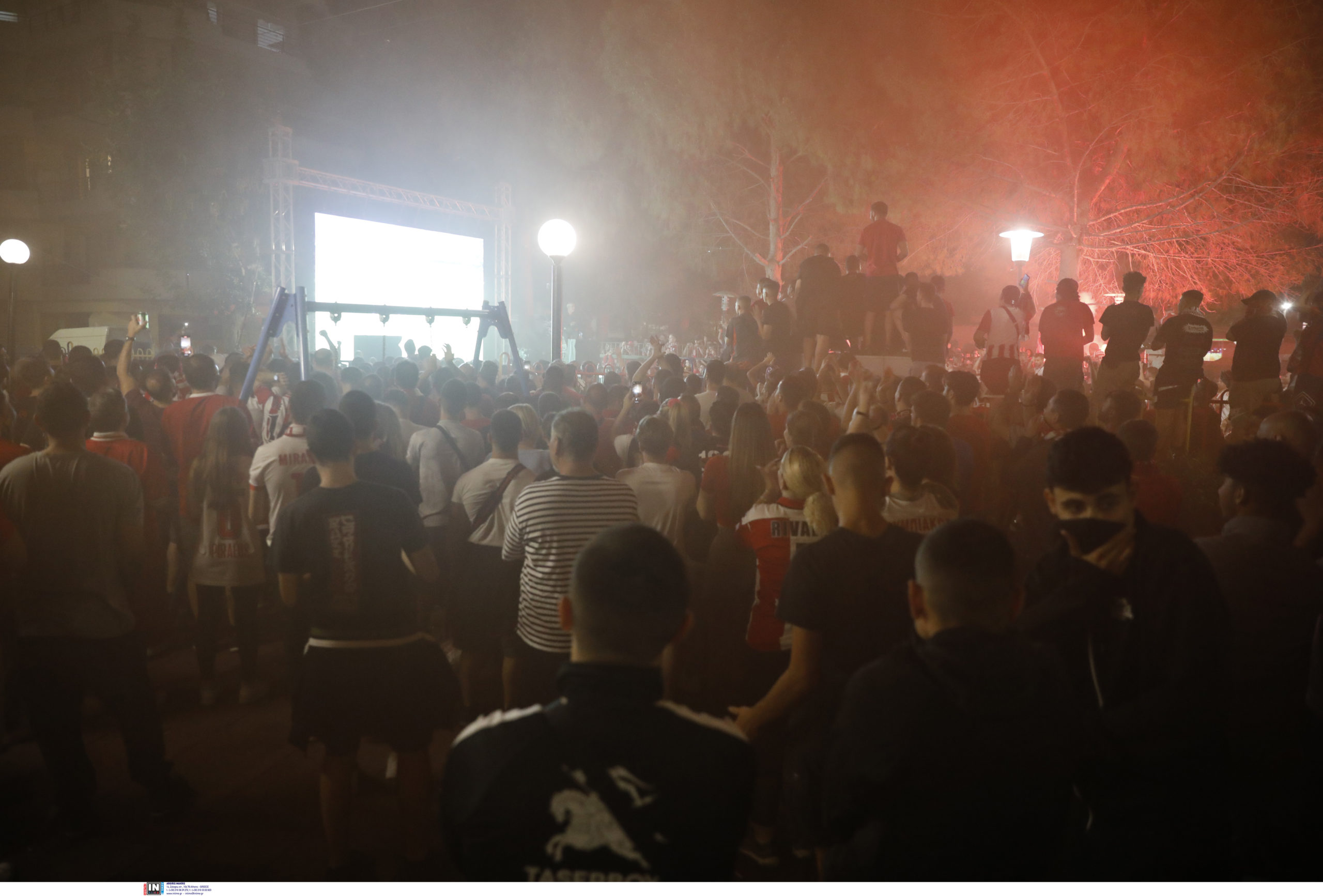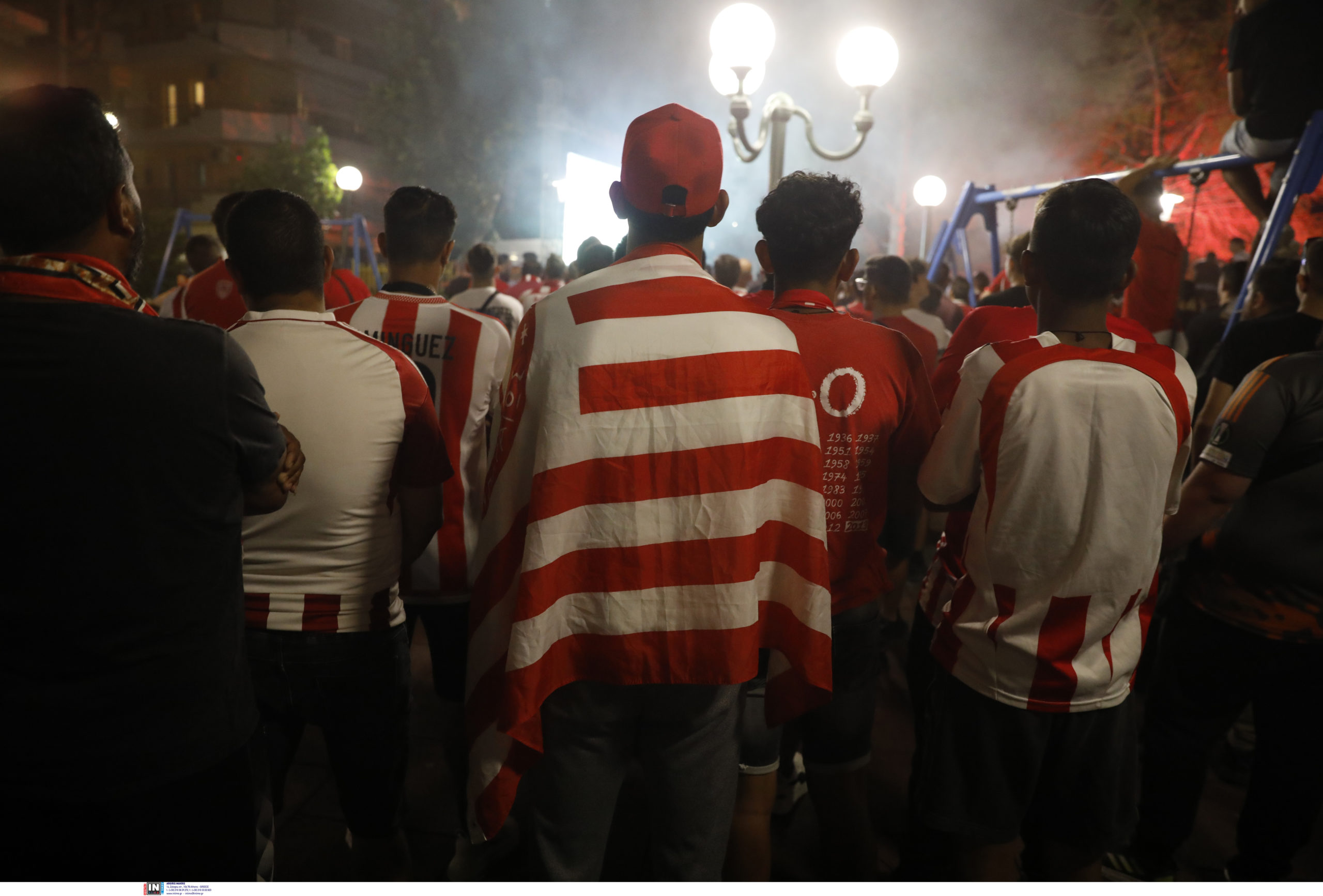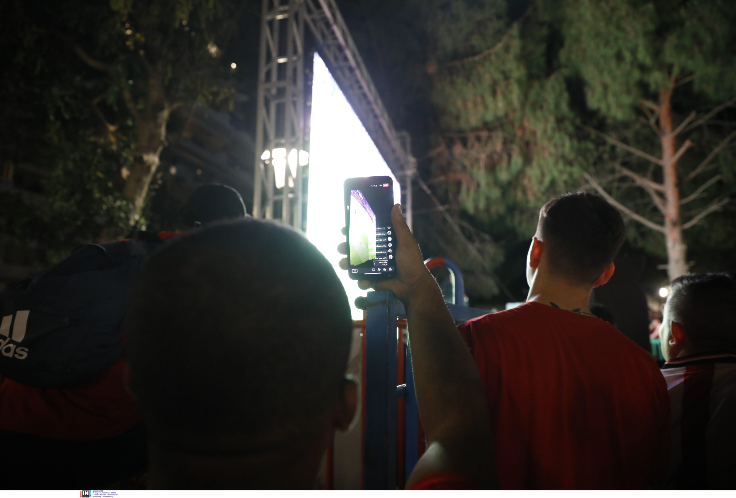Τόσο στα Καμίνια όσο και στη Μαρίνα Ζέας έχουν στηθεί γιγαντοθόνες και χιλιάδες φίλοι του Ολυμπιακού έχουν μαζευτεί και παρακολουθούν τον ιστορικό τελικό.