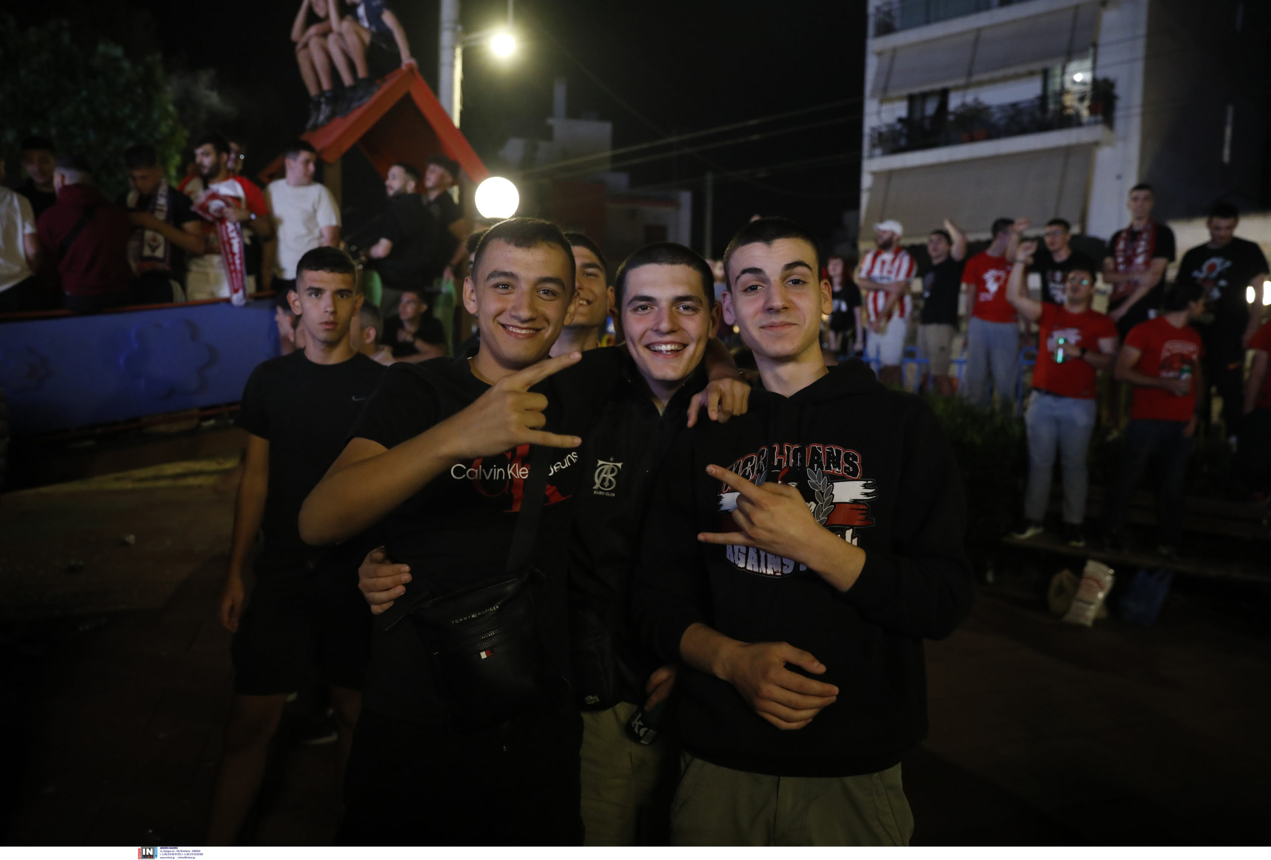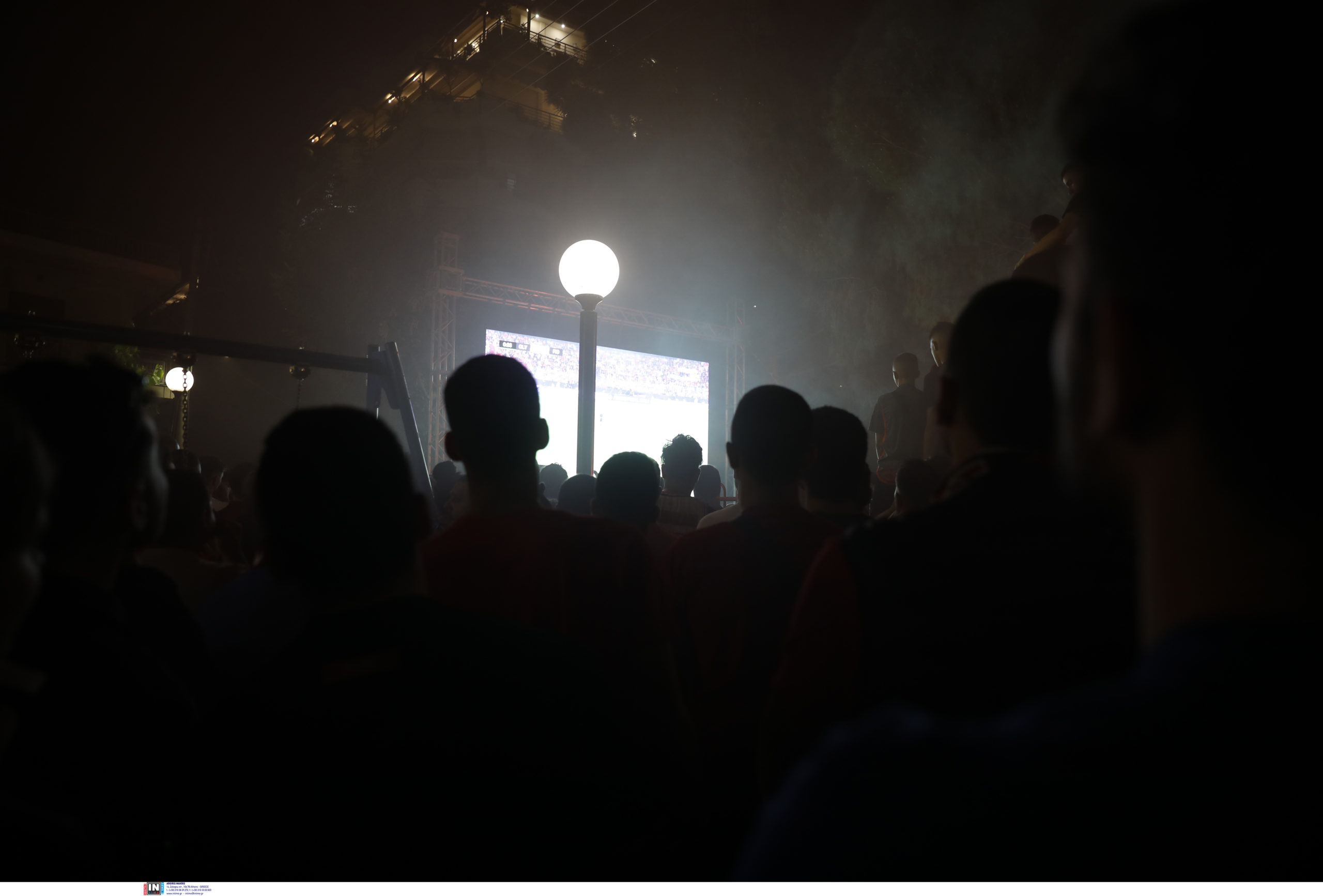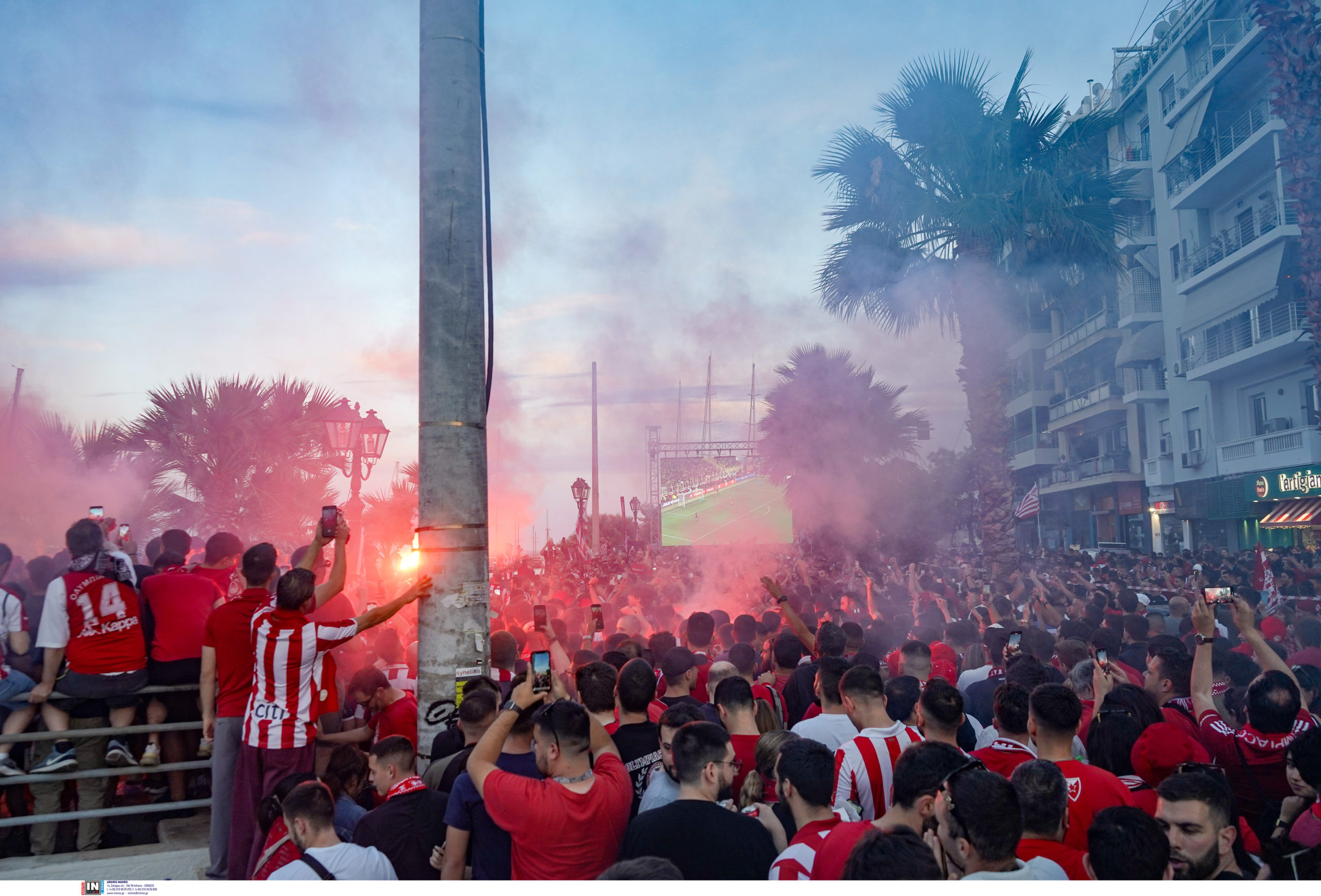 Τόσο στα Καμίνια όσο και στη Μαρίνα Ζέας έχουν στηθεί γιγαντοθόνες και χιλιάδες φίλοι του Ολυμπιακού έχουν μαζευτεί και παρακολουθούν τον ιστορικό τελικό.