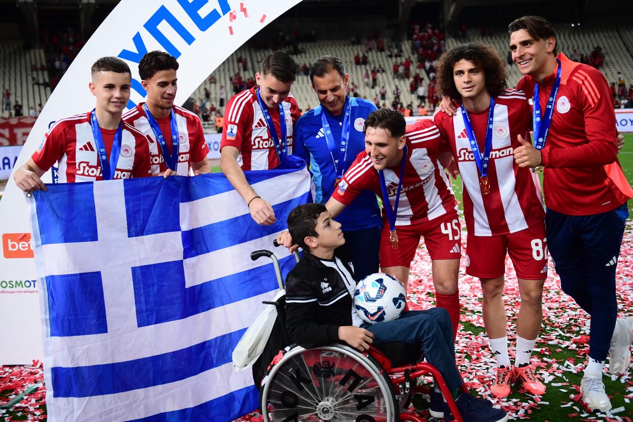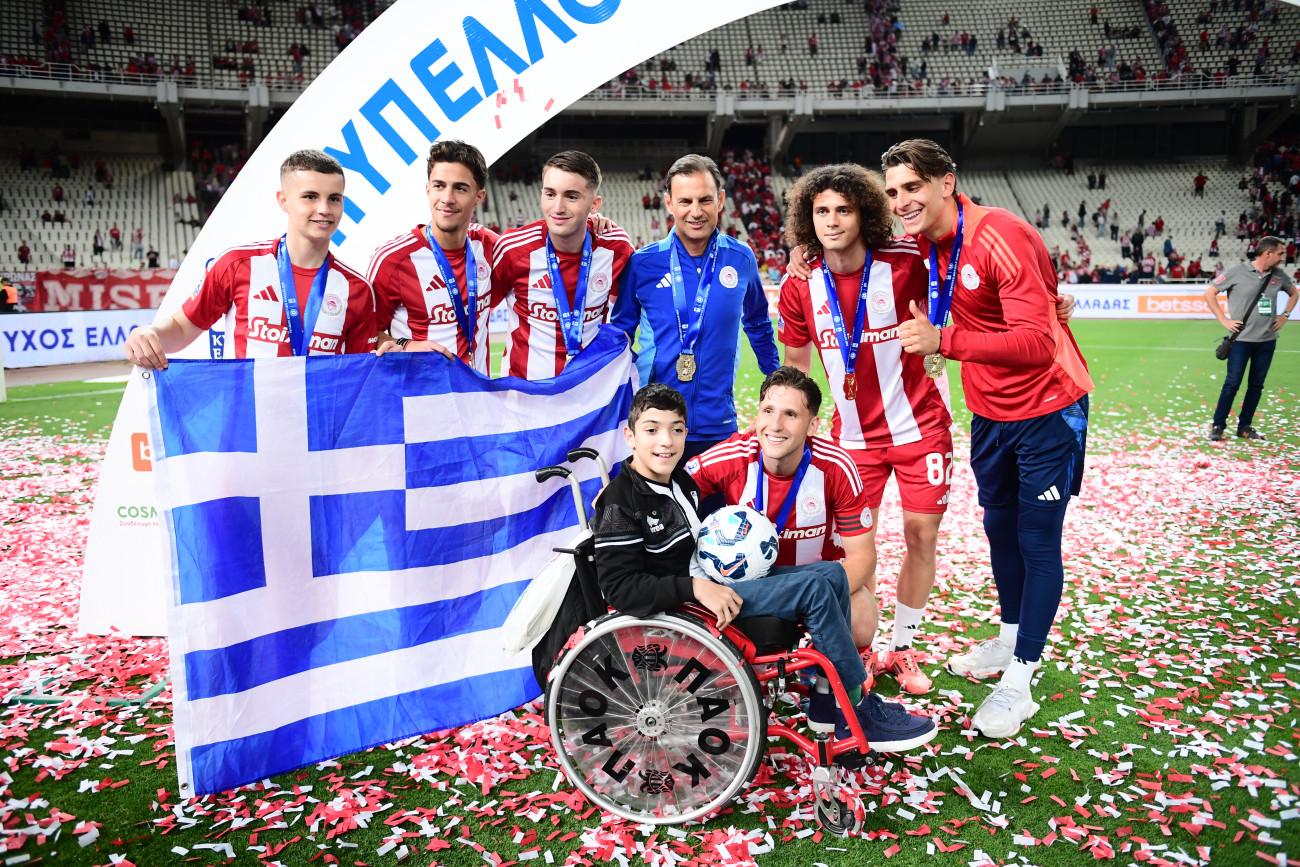 Ο μικρός Γιαννάκης, πανευτυχής και χαμογελαστός, πόζαρε κρατώντας το Κύπελλο Ελλάδας Betsson, πλαισιωμένος από τον ισχυρό άνδρα των «ερυθρόλευκων» και τον αρχηγό του συλλόγου. «Έλα να το σηκώσεις κι εσύ», του είπαν, σε μια σκηνή που συγκίνησε όσους βρίσκονταν εκεί.