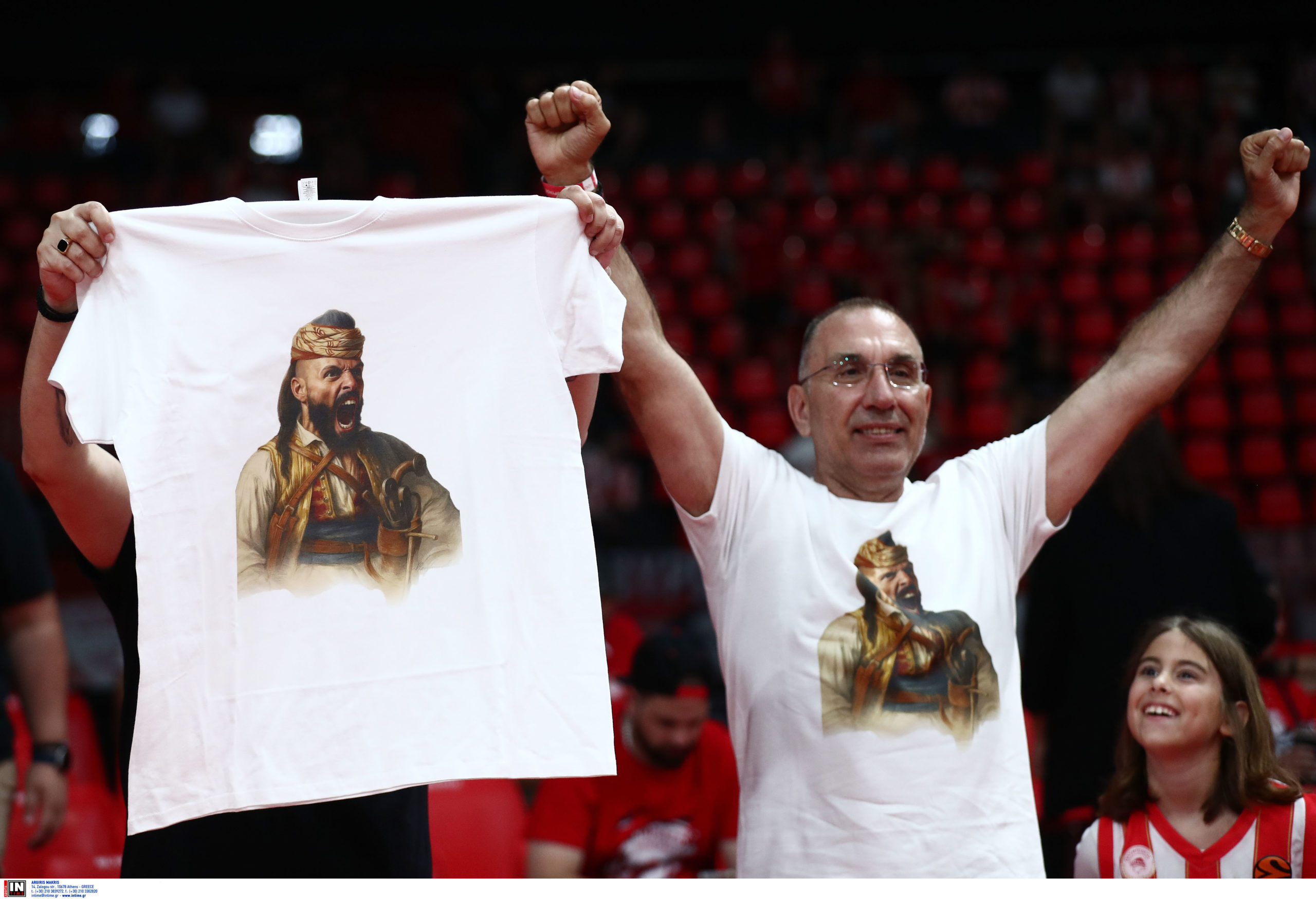 • Οι φίλαθλοι του Ολυμπιακού τοποθέτησαν ελληνικές σημαίες πίσω από τον πάγκο του Παναθηναϊκού, ενώ δημιούργησαν μια φανέλα με τη μορφή του Κολοκοτρώνη, βάζοντας όμως στη θέση του προσώπου του Έλληνα οπλαρχηγού της επανάστασης του 1821 τον Εβάν Φουρνιέ.