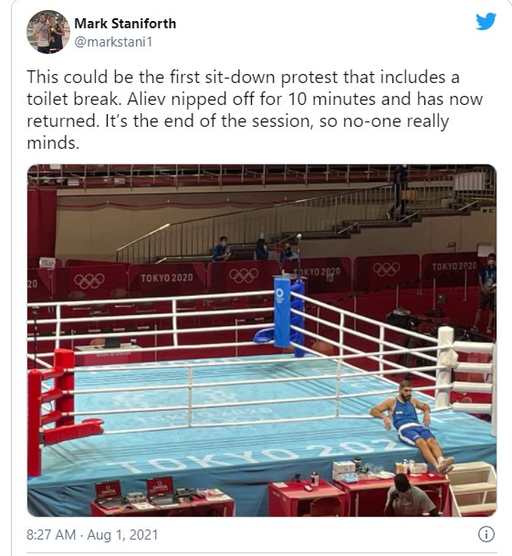 Στη συνέχεια αφού πήγε στην τουαλέτα επέστρεψε στο ρινγκ για μια… καθιστική διαμαρτυρία, όπως αναφέρουν χρήστες στο Twitter.