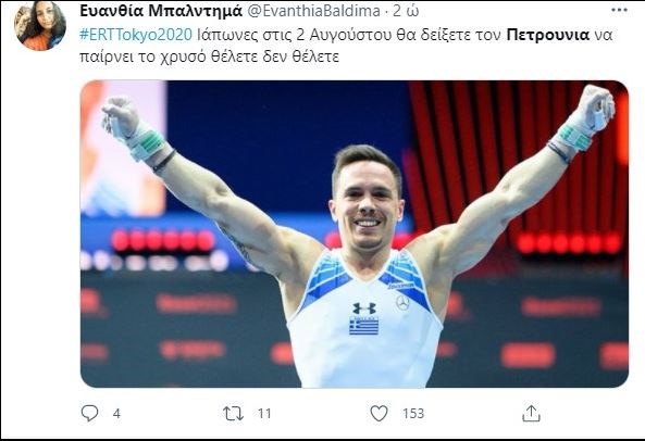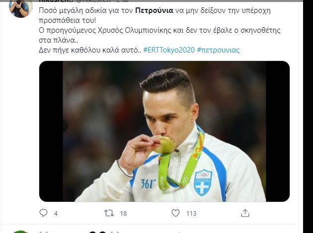 Τα social media πήραν… φωτιά όταν διαπιστώθηκε το «μαύρο» στον κορυφαίο Έλληνα αθλητή με τους περισσότερους να τα βάζουν… με την ΕΡΤ. Στο twitter σχόλια του τύπου «πόσο άδικο είναι για τον Πετρούνια να μην δείξουν την υπέροχη προσπάθειά του» ή «Ιάπωνες, θα δείξετε τον Πετρούνια θέλετε δεν θέλετε όταν πάρει το χρυσό», κυριαρχούσαν. Μέχρι και τον Τσακ Νόρις επιστράτευσαν κάποιοι «τρολάροντας», λέγοντας ότι μόνο εκείνος κατάφερε και είδε την προσπάθεια του Πετρούνια.