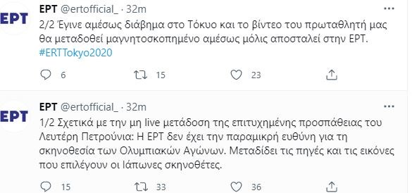 Η ΕΡΤ στην επίσημη απάντησή της μέσω των λογαριασμών της στα social media τόνισε τα εξής: “Σχετικά με τη μη live μετάδοση της επιτυχημένης προσπάθειας του Λευτέρη Πετρούνια: Η ΕΡΤ δεν έχει την παραμικρή ευθύνη για τη σκηνοθεσία των Ολυμπιακών Αγώνων. Μεταδίδει τις πηγές και τις εικόνες που επιλέγουν οι Ιάπωνες σκηνοθέτες”. Σε δεύτερη ανάρτησή της προσθέτει ότι “έγινε αμέσως διάβημα στο Τόκιο και το βίντεο του πρωταθλητή μας θα μεταδοθεί μαγνητοσκοπημένο αμέσως μόλις αποσταλεί στην ΕΡΤ”.