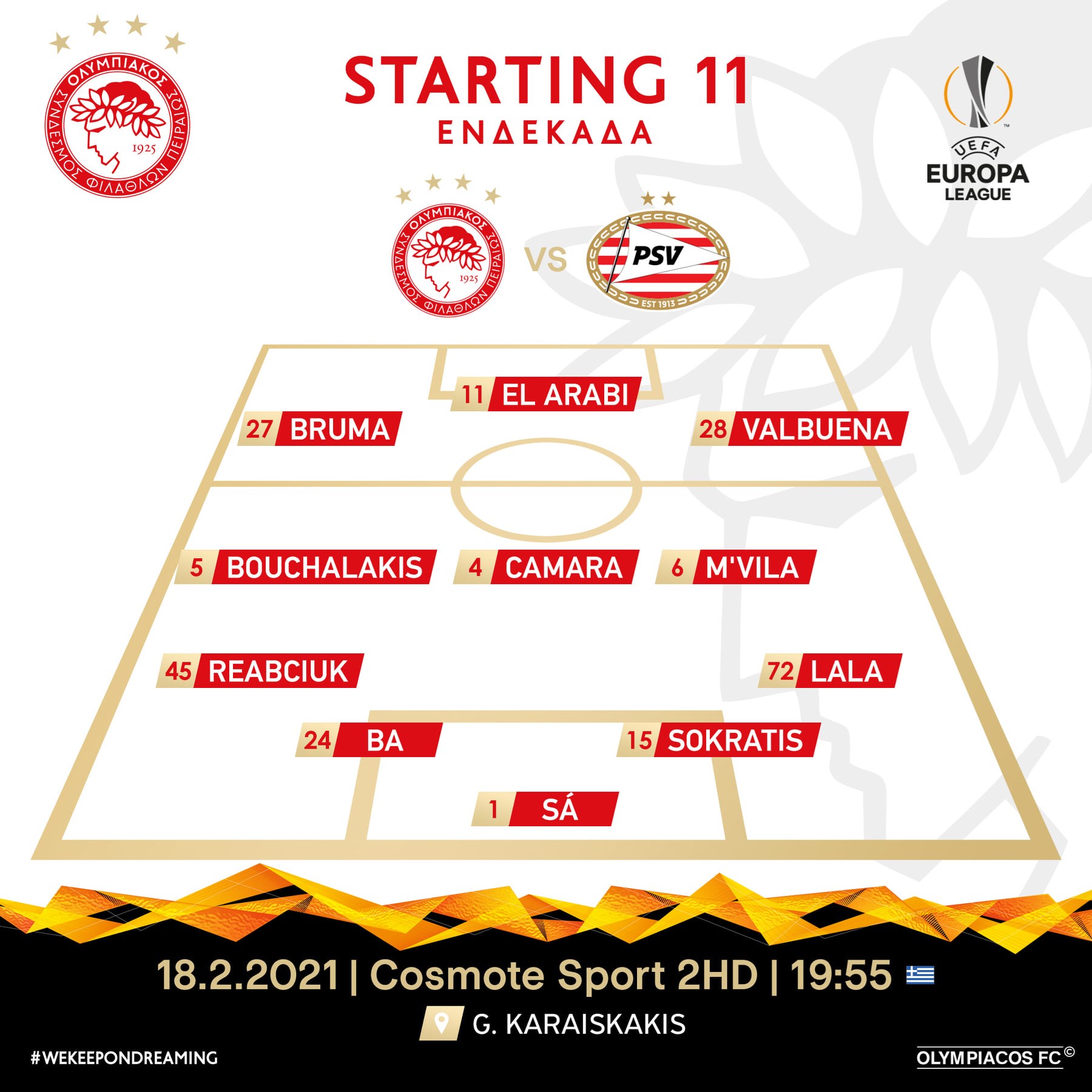 Πριν από λίγο έγινε γνωστή η ενδεκάδα με την οποία θα παραταχθεί ο Ολυμπιακός κόντρα στην Αϊντχόφεν (19.55) στον πρώτο αγώνα για τους “32” του Europa League. O Πέδρο Μαρτίνς επέλεξε το 4-3-3, καθώς ο Εμβιλά ξεπέρασε τον τραυματισμό του και βρίσκεται στην αρχική ενδεκάδα.