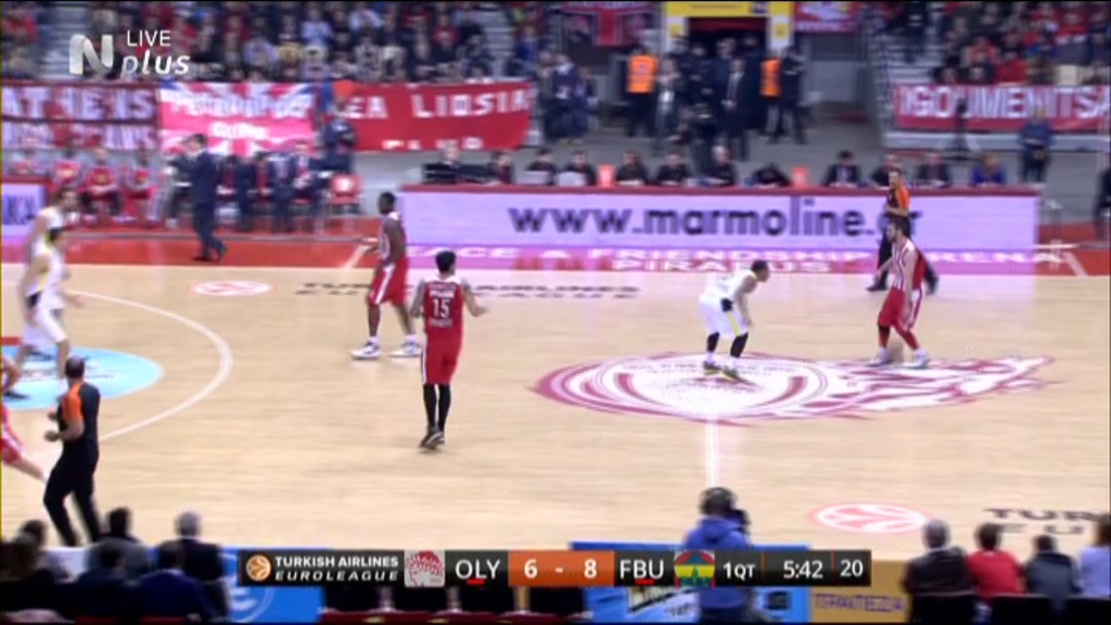 Ισόπαλο 19-19 έληξε το πρώτο δεκάλεπτο στο ΣΕΦ ανάμεσα στον Ολυμπιακό και τη Φενέρ. Πρώτοι σκόρερ της ελληνικής ομάδας ο Πρίντεζης και ο Μάντζαρης με 4 πόντους.